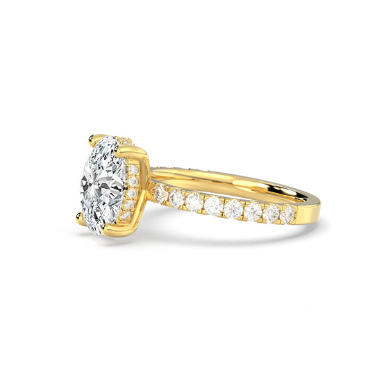 En elegant og moderne forlovelsesring, hvor en strålende oval diamant står i centrum. Ringen har et tidløst design, der fremhæver diamantens glans og passer perfekt til enhver stil. En klassisk og stilren ring, der symboliserer kærlighed.