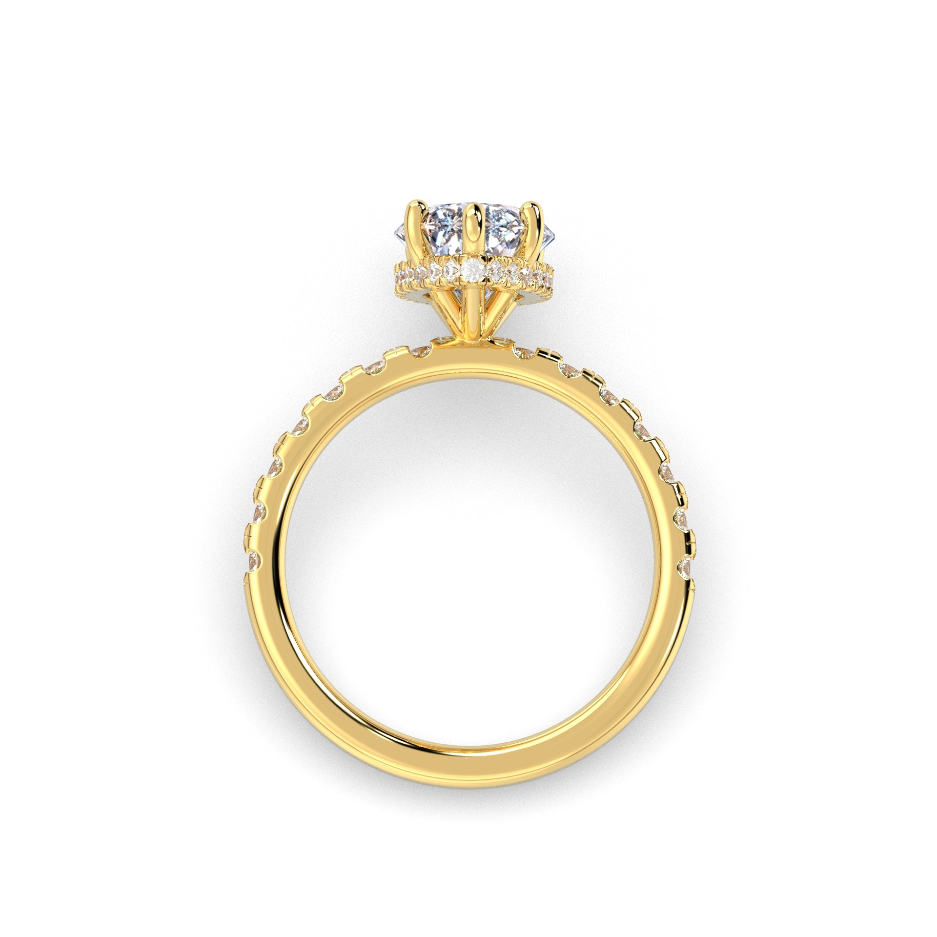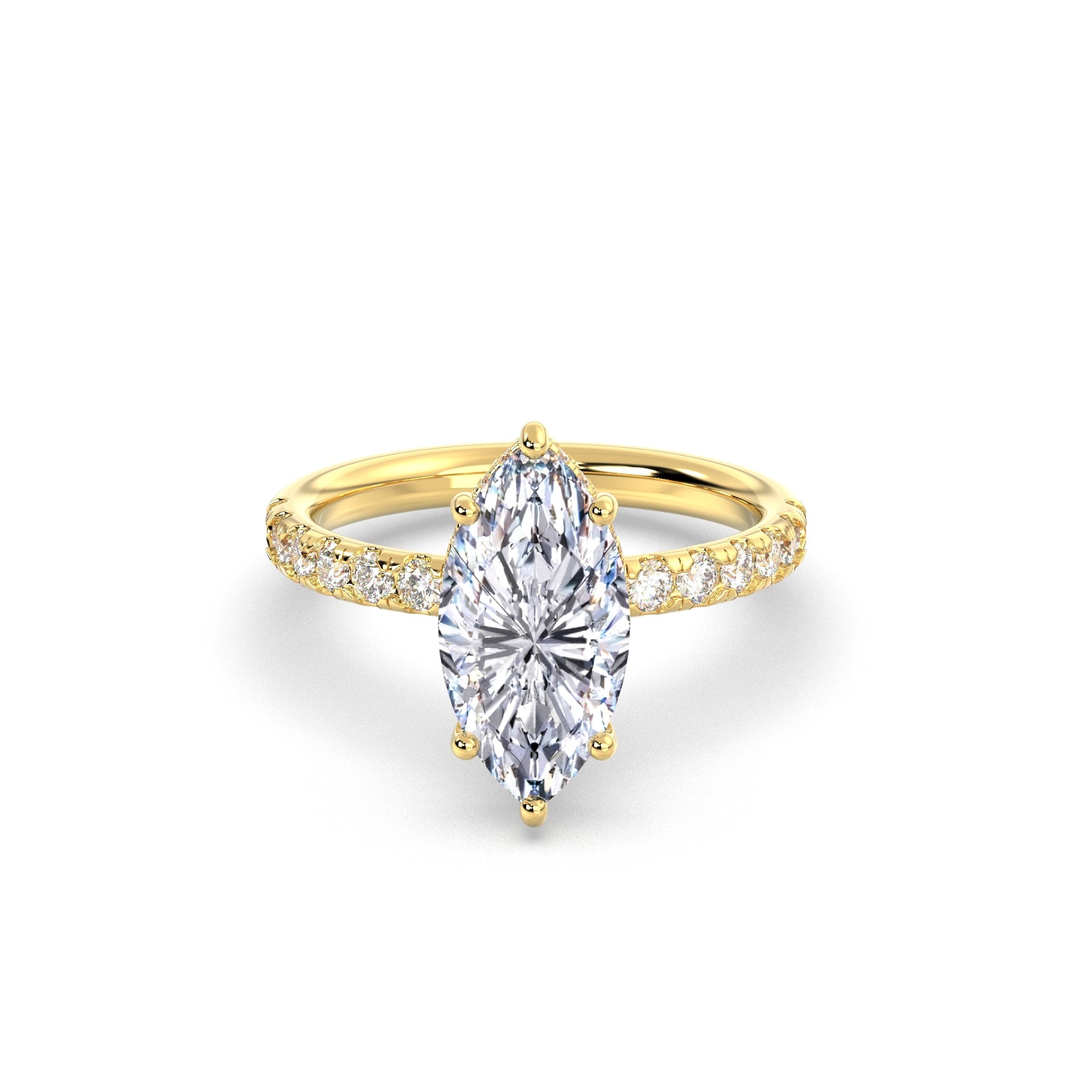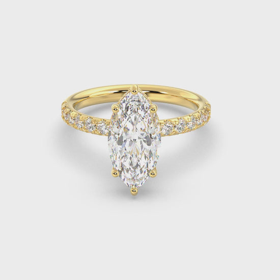 En strålende forlovelsesring med et moderne og elegant udtryk. Den smukke marquise-slebne diamant er centrum i designet, omkranset af en diskret halo under stenen, som giver ekstra spil i lyset. Langs ringskinnen er der pavé-satte sidesten, der tilfører ringen en glitrende og unikt finish. Du kan tilpasse antallet og størrelsen af sidestenene, så ringen designes helt efter dine ønsker.